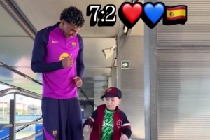 每体:波兰10岁小球迷患有骨骼生长障碍,亚马尔3C亲切探望并互动