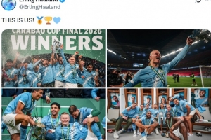 哈兰德也在社媒晒出与众位队友开心庆祝合影,配文写道:“这就是我们!”
