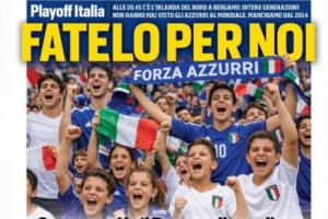 罗体今天的封面是一群年轻球迷身穿意大利球衣为意大利国家队呐喊助威的图片,图中AI痕迹明显。一段文字还指出,已经有整整一代人没有目睹意大利征战世界杯。