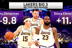 体育资讯3月3日讯 今日,电视节目《First Thing First》晒出一组湖人三巨头东契奇、詹姆斯、里夫斯的同场净效值数据对比。