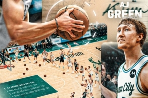 首节比赛中,AJ·格林命中3记三分,本赛季三分命中数来到300记,超越雷·阿伦(00-01赛季/299记)升至队史第一。