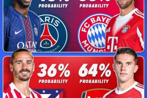 Score 90对4队晋级决赛的概率进行了预测,拜仁55%,巴黎圣日耳曼45%,阿森纳64%,马竞36%。