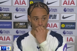 体育资讯4月19日讯 热刺在本轮英超2-2遭布莱顿绝平,取得进球的哈维·西蒙斯在赛后接受采访被问及相关话题。